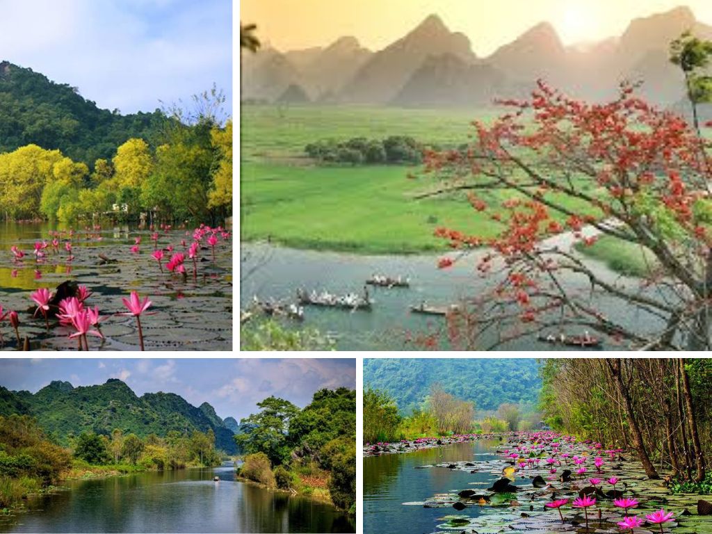 Trên thuyền, bạn sẽ có thể ngắm nhìn những cánh đồng lúa xanh rì và những ngọn núi đá vôi trùng điệp. Bên trái thuyền là Núi Phượng Hoàng và Núi Đồi Chèo. Bên phải của thuyền là núi Ngũ Nhạc, nơi có Đền Trình, nơi du khách thường dừng lại để thắp hương cầu nguyện cho Thần Núi. Ngoài ra, bạn còn có cơ hội được nghe những truyền thuyết thú vị gắn liền với Núi Bung và Núi Voi.