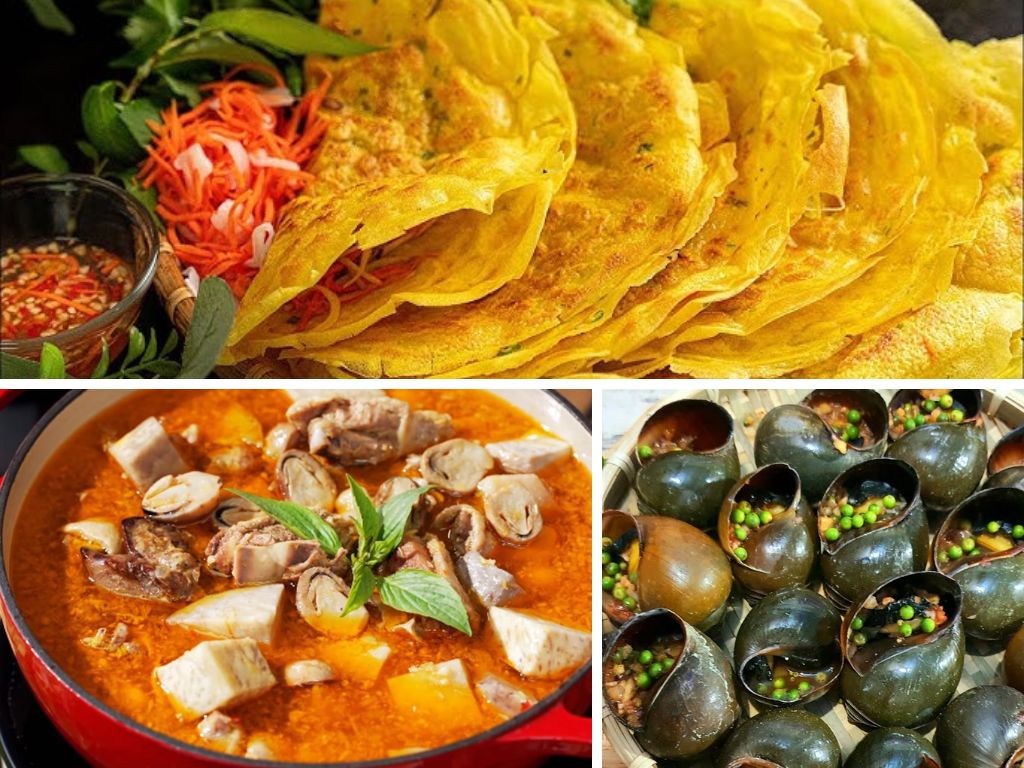 - Với lớp vỏ vàng giòn và nhân thịt, tôm béo ngậy, bánh xèo được cuốn với rau sống và chấm nước mắm đậm đà.